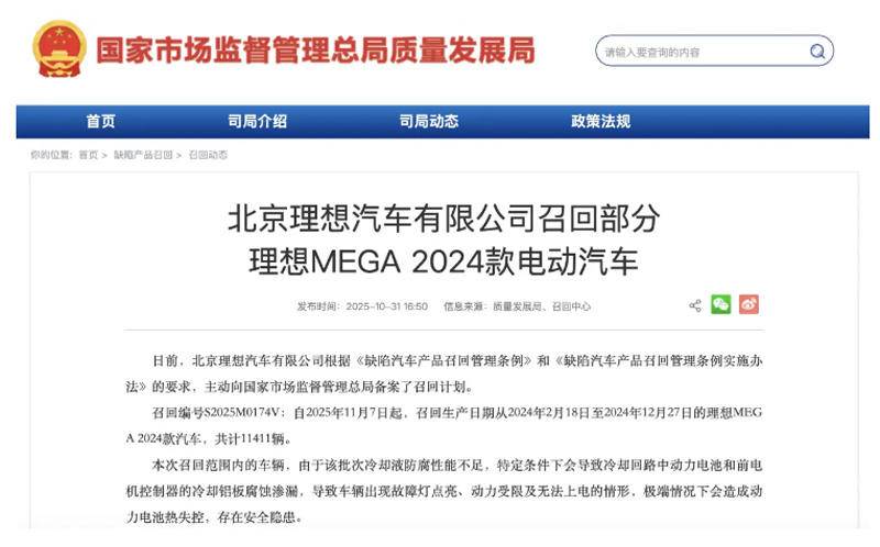 《车矩阵》行业点评:10月31日国家市场监管总局官网显示:北京理想汽车有限公司主动向总局备案召回了11411辆从2024年2月18日至2024年12月27日的理想MEGA,全部为2024款车型,执行日期自2025年11月7日起。厂家给出的具体召回原因是由于该批次冷却液防腐性能不足长江配资,特定条件下会导致冷却回路中动力电池和前电机控制器的冷却铝板腐蚀渗漏,导致车辆出现故障灯点亮、动力受限及无法上电的情形,极端情况下会造成动力电池热失控,存在安全隐患。