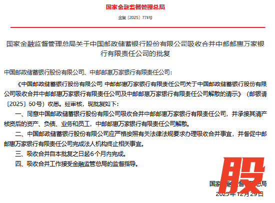 1月4日金融一线消息,国家金融监督管理总局发布关于中国邮政储蓄银行股份有限公司吸收合并中邮邮惠万家银行有限责任公司的批复,同意中国邮政储蓄银行股份有限公司吸收合并中邮邮惠万家银行有限责任公司,并承接其清产核资后的资产、负债、业务和员工,中邮邮惠万家银行有限责任公司解散。
