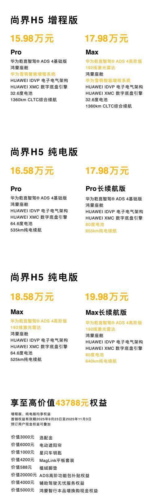 9月23日,在鸿蒙智行秋季新品发布会上,尚界H5正式官宣上市,推出了6款配置车型,包括纯电、增程两种动力形式,售价区间为15.98-19.98万元,全系没有超过20万元,是目前鸿蒙智行价格最低的SUV。同时,新车还推出了价值43788元的权益信钰配资,包括电动遮阳帘、MagLink平板套装等等。